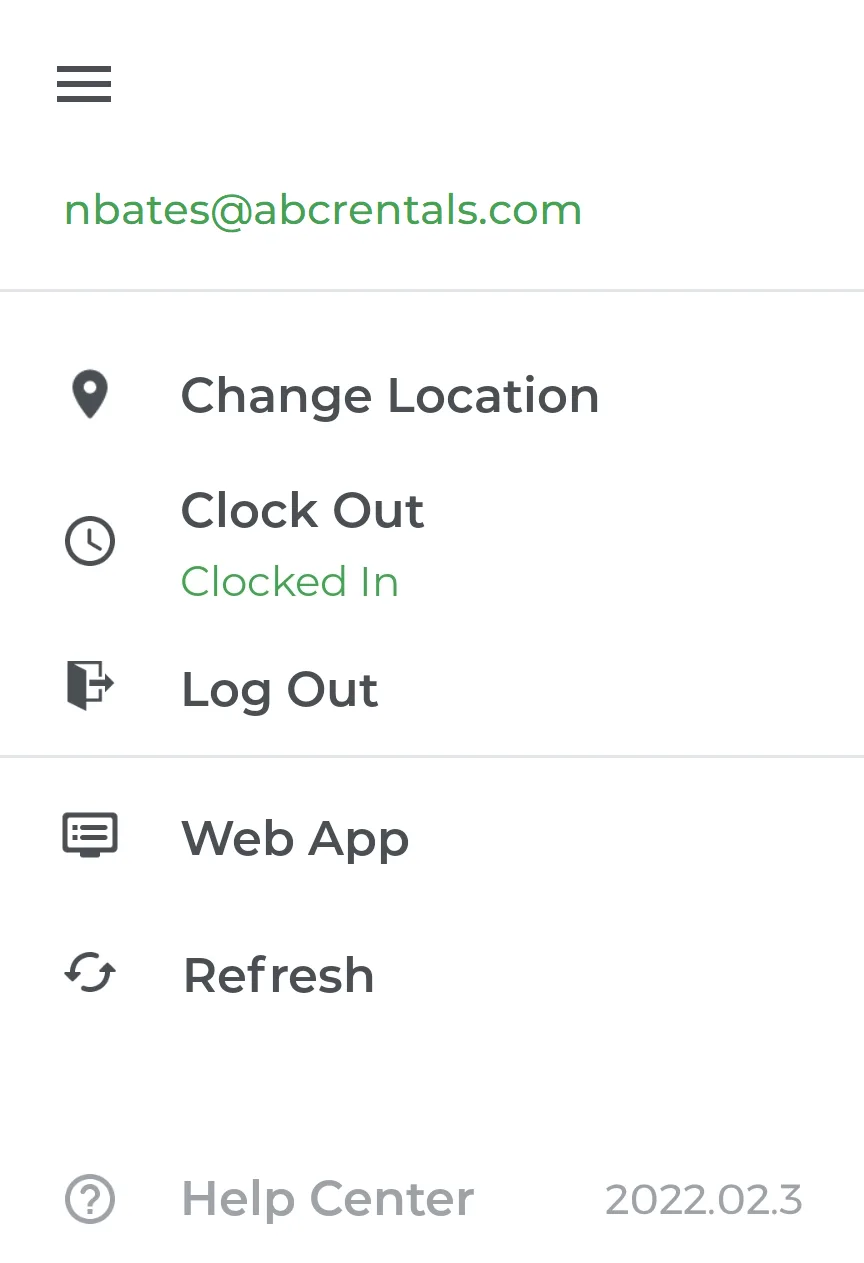 Clock in or out of the application. Time logged in Service & Rental Mobile can be reviewed by counter operators in Service, Rental, and Financials (Next). For Mechanics, starting work on a Work Order will also automatically clock the user in.